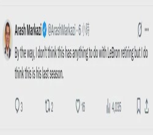 此外,湖人跟队记者Arash Markazi表示,他始终认为这次预告与退役无关,“但我确实觉得这会是詹姆斯的最后一个赛季”。