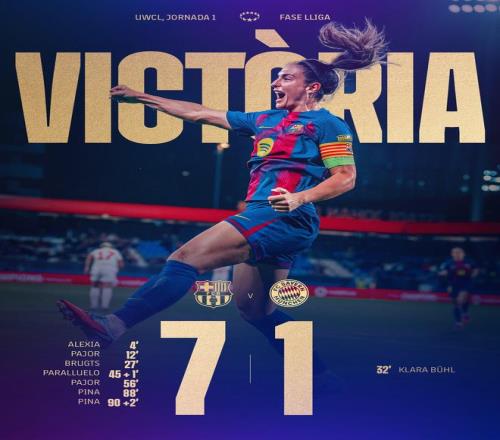 雷速体育10月8日宣 女足欧冠联赛首轮对阵中,巴萨女足以7-1的比分在主场狂胜拜仁女足,送给对手“七喜”。